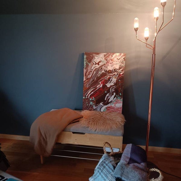 Abstrakt tavla handmålad med olika tekniker som skapar form, färg och djup på en annan nivå. Tavlan är målad på återvunnen canvas duk vilket ger en unik färgkombination och lyster. Stl 40x60cm. Kan hängas både stående och liggande.